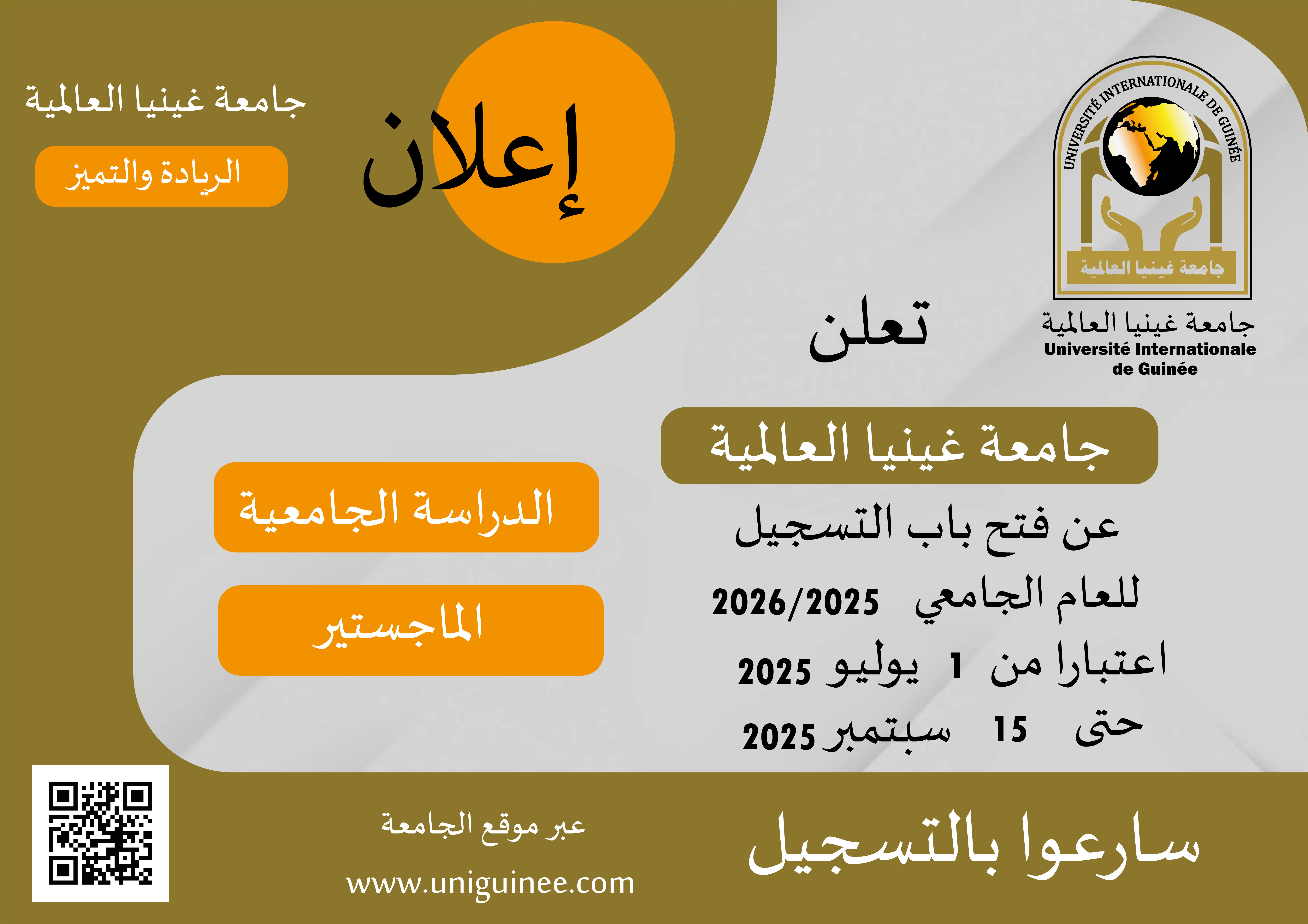 تعلن جامعة غينيا العالمية عن فتح باب التسجيل للعام الجامعي 2025/2026 إعتبارا من 1 يوليو 2025 وحتي 15 سبتمبر 2025، وتدعو جميع المهتمين سرعة التسجيل عبر الرابط أدناه.للالتحاق بالجامعة اضغط هنا